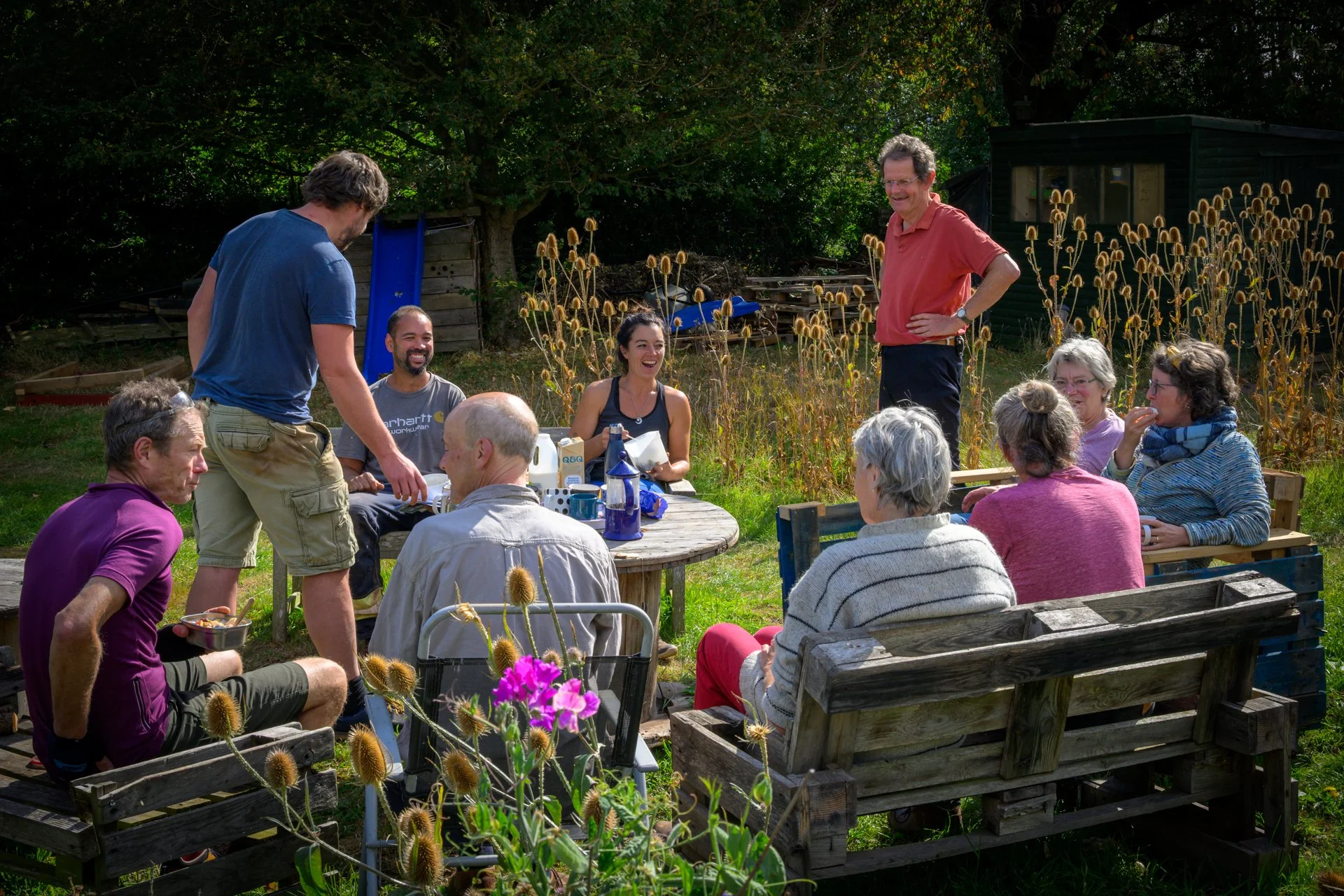 Growers, volunteers and board members relaxing together after an afternoon’s work